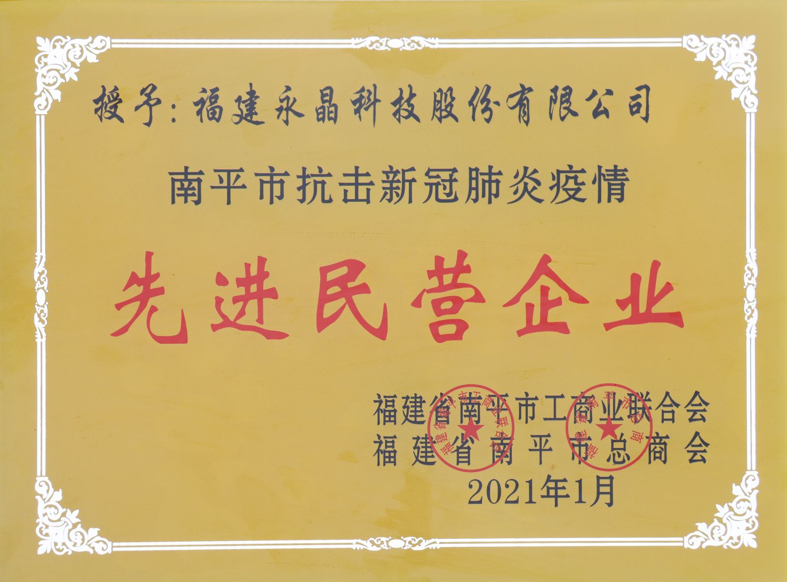 近日,福建永晶科技股份有限公司(以下簡(jiǎn)稱永晶科技)被南平市工商業(yè)聯(lián)合會(huì)、南平總商會(huì)授予“南平市抗擊新冠肺炎疫情先進(jìn)民營(yíng)企業(yè)”榮譽(yù)稱號(hào)。以此表彰永晶科技在疫情防控期間積極履行企業(yè)社會(huì)責(zé)任、奮力投身抗疫行動(dòng)、踐行公益慈善事業(yè)所作出的突出貢獻(xiàn)。